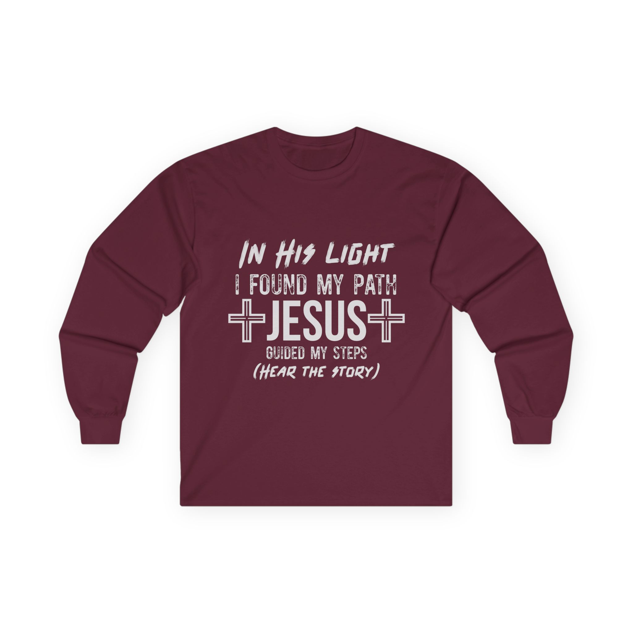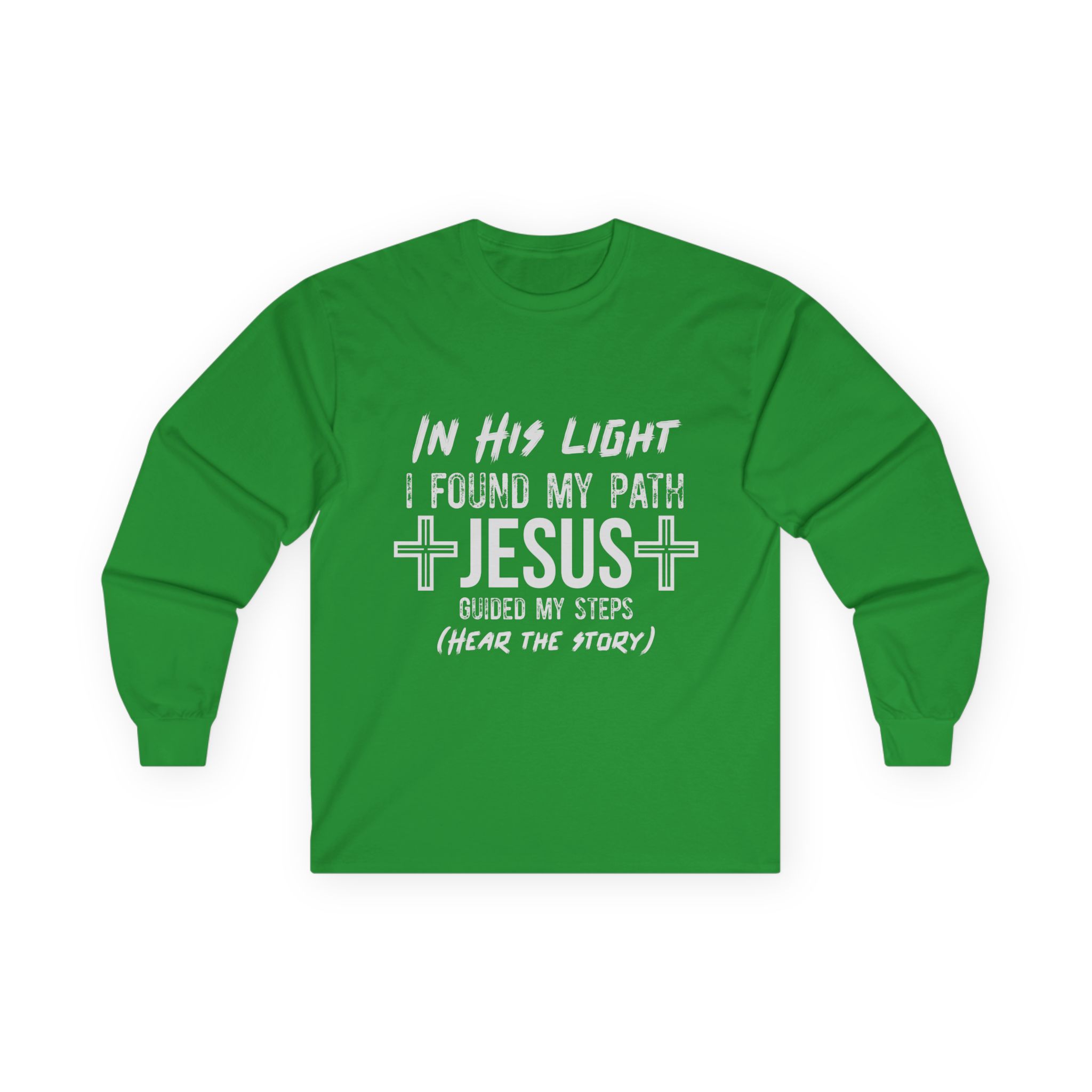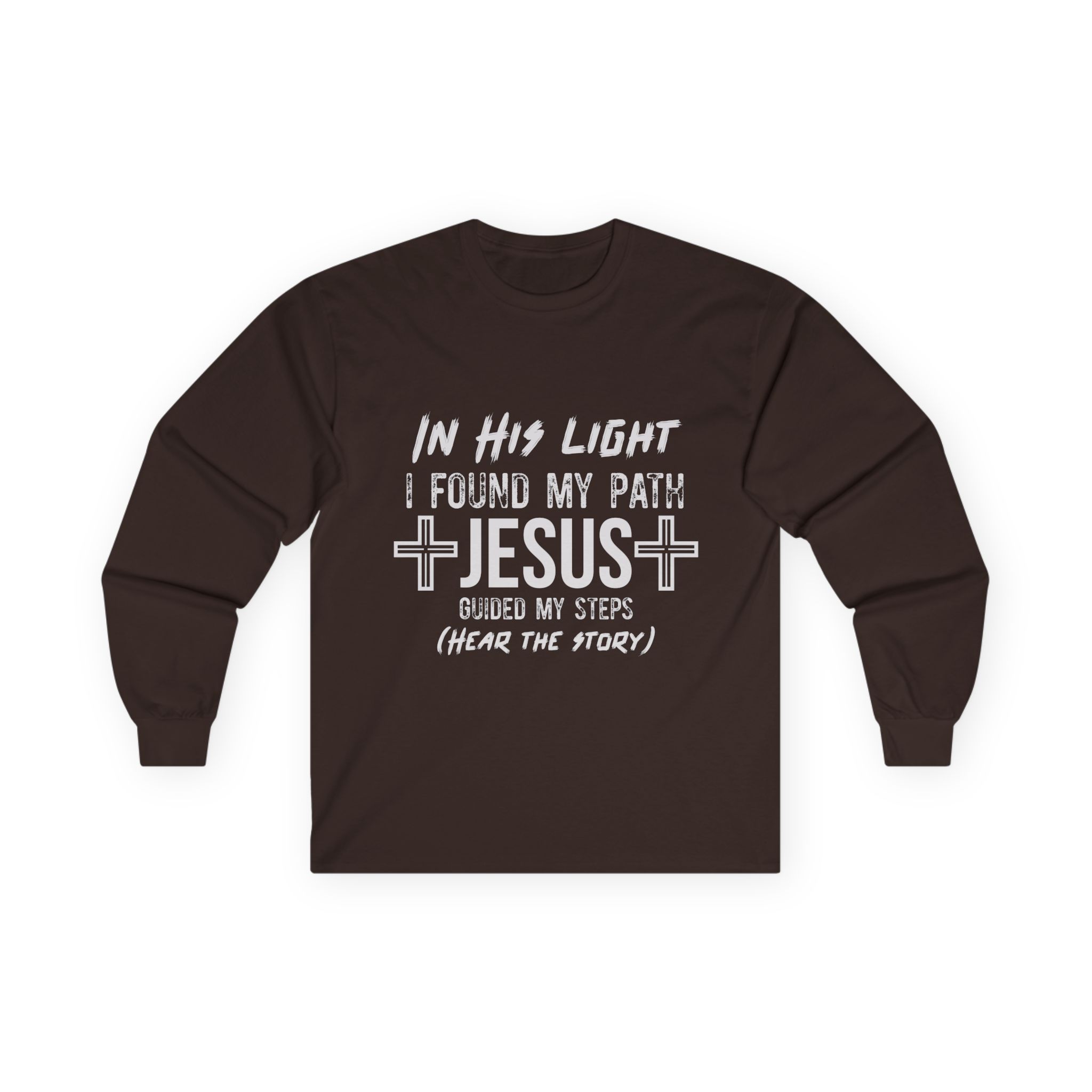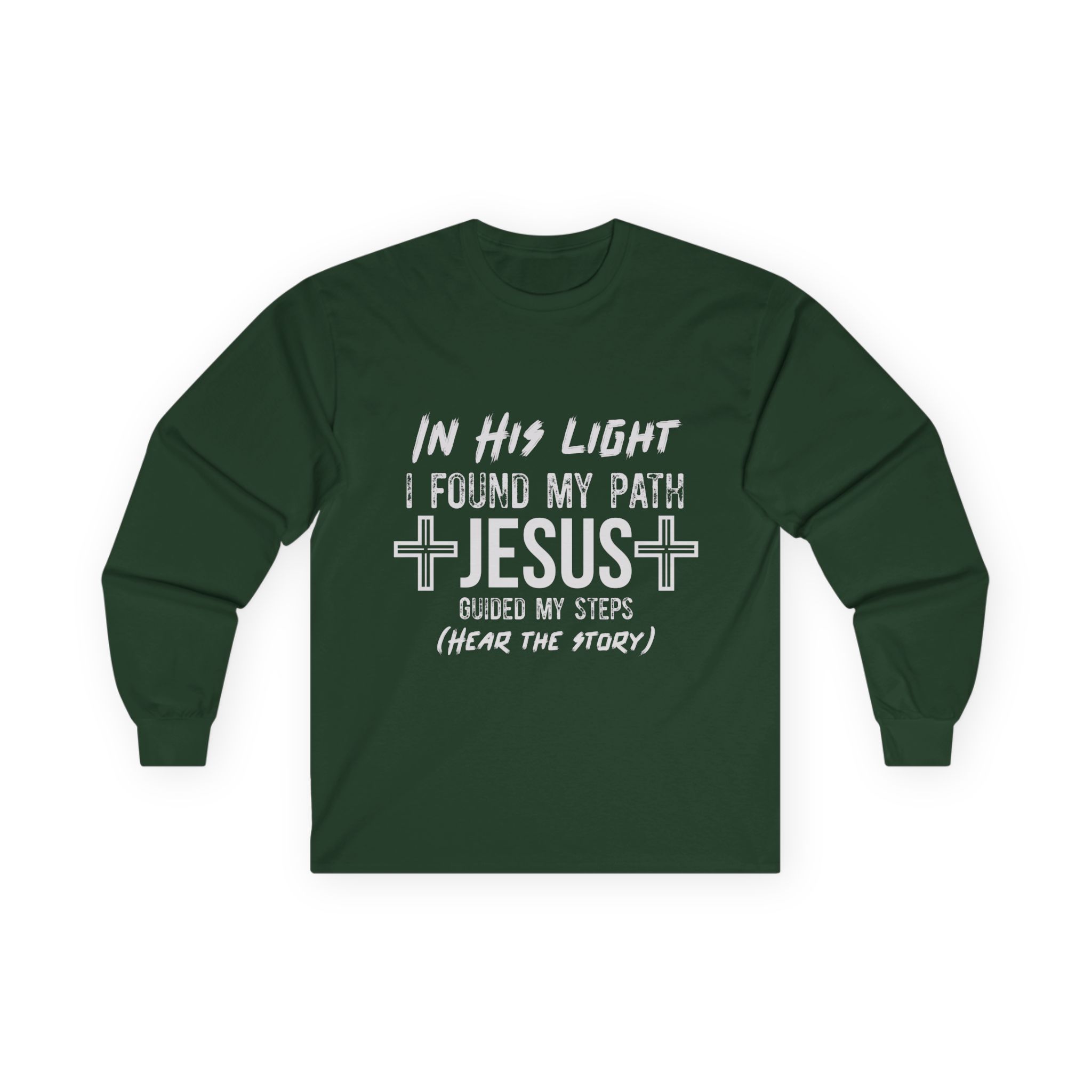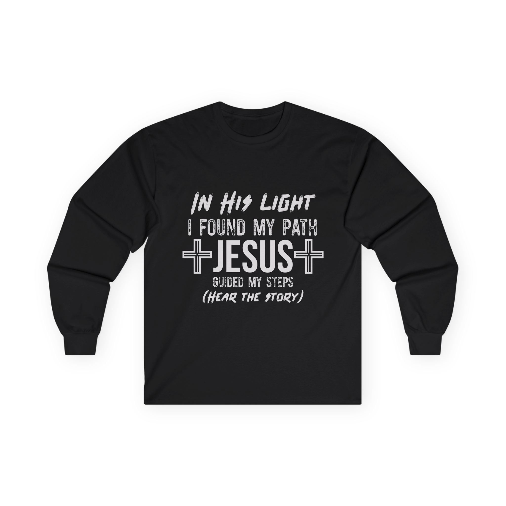 Soft, thoughtful, and quietly bold — this long sleeve tee carries a gentle testimony across the chest: “In His light I found my path. Jesus guided my steps (hear the story).” The heavier vintage-feel cotton and classic fit give it a lived-in comfort that layers well under a jacket or stands on its own during cooler evenings at church, fellowship events, or casual meetups. Tubular knit construction and shoulder tape keep the silhouette clean and durable, while the ribbed collar and sewn-in label add subtle, lasting details. Wear it when you want your faith to be seen without shouting — a calm, wearable reminder of a journey and an invitation to share it.