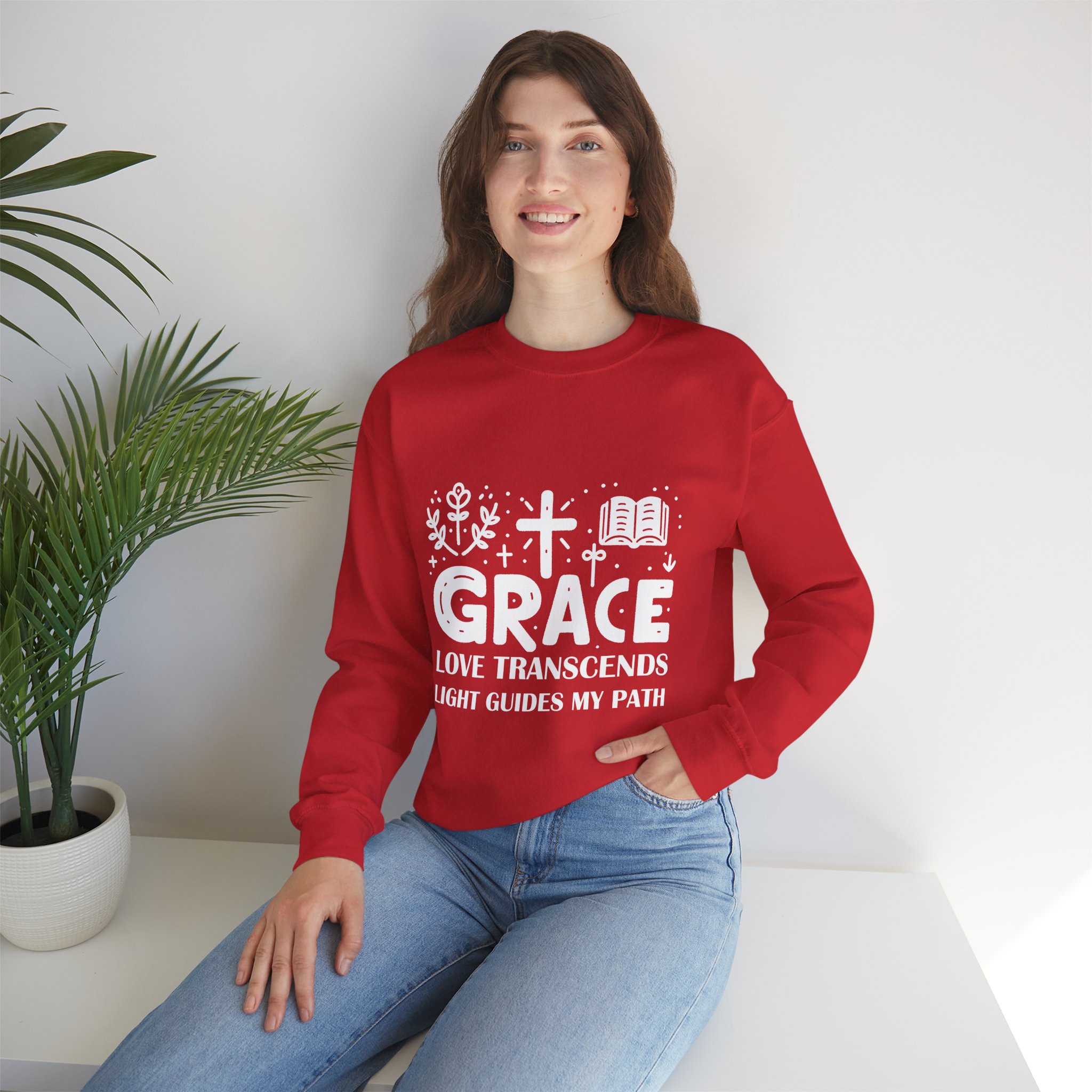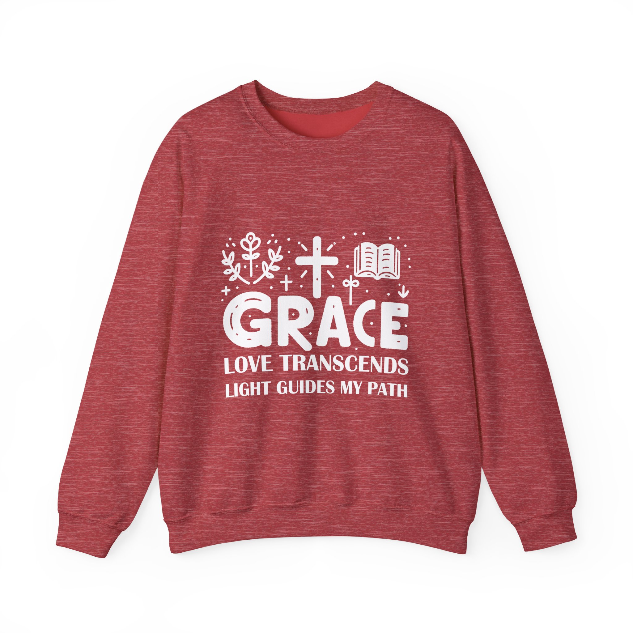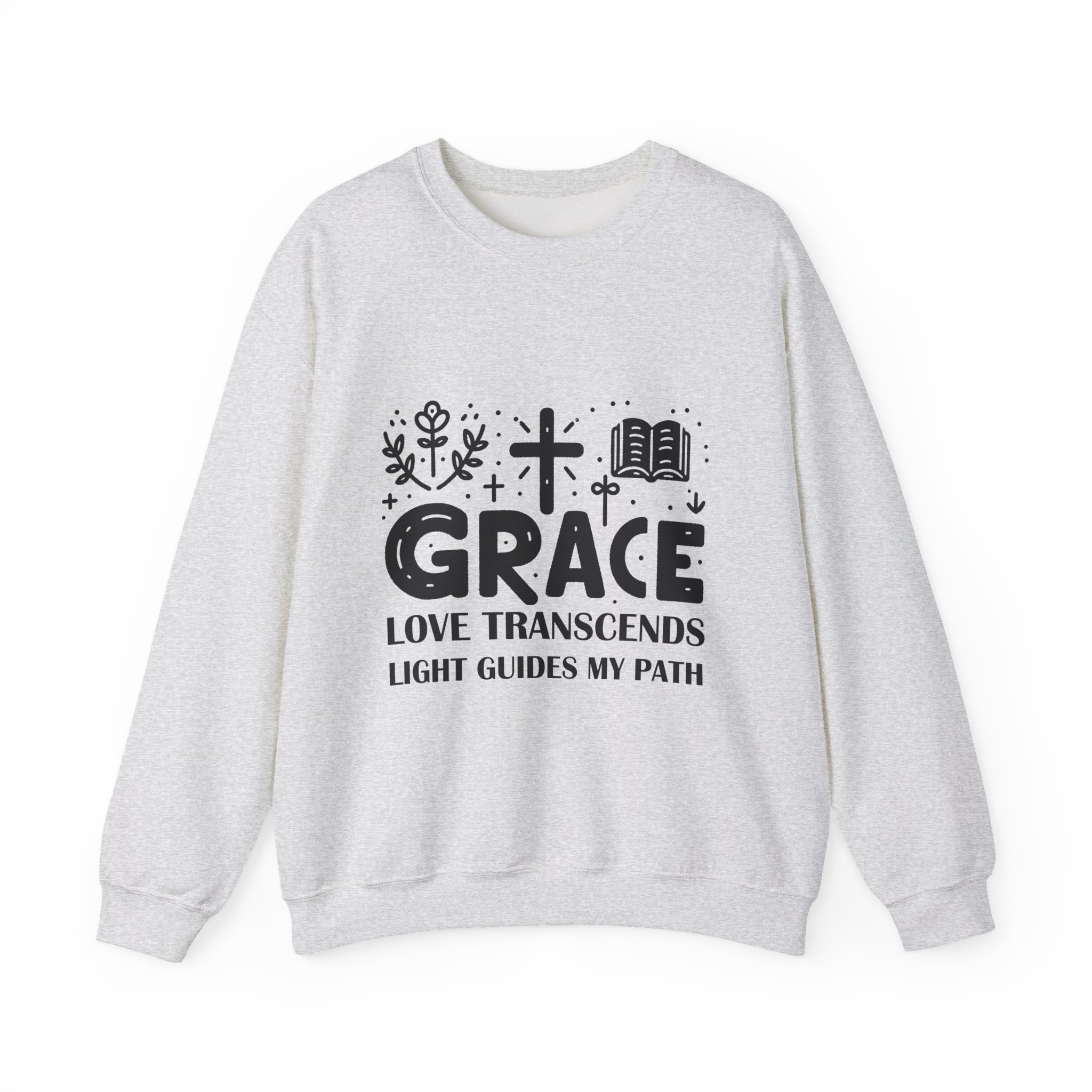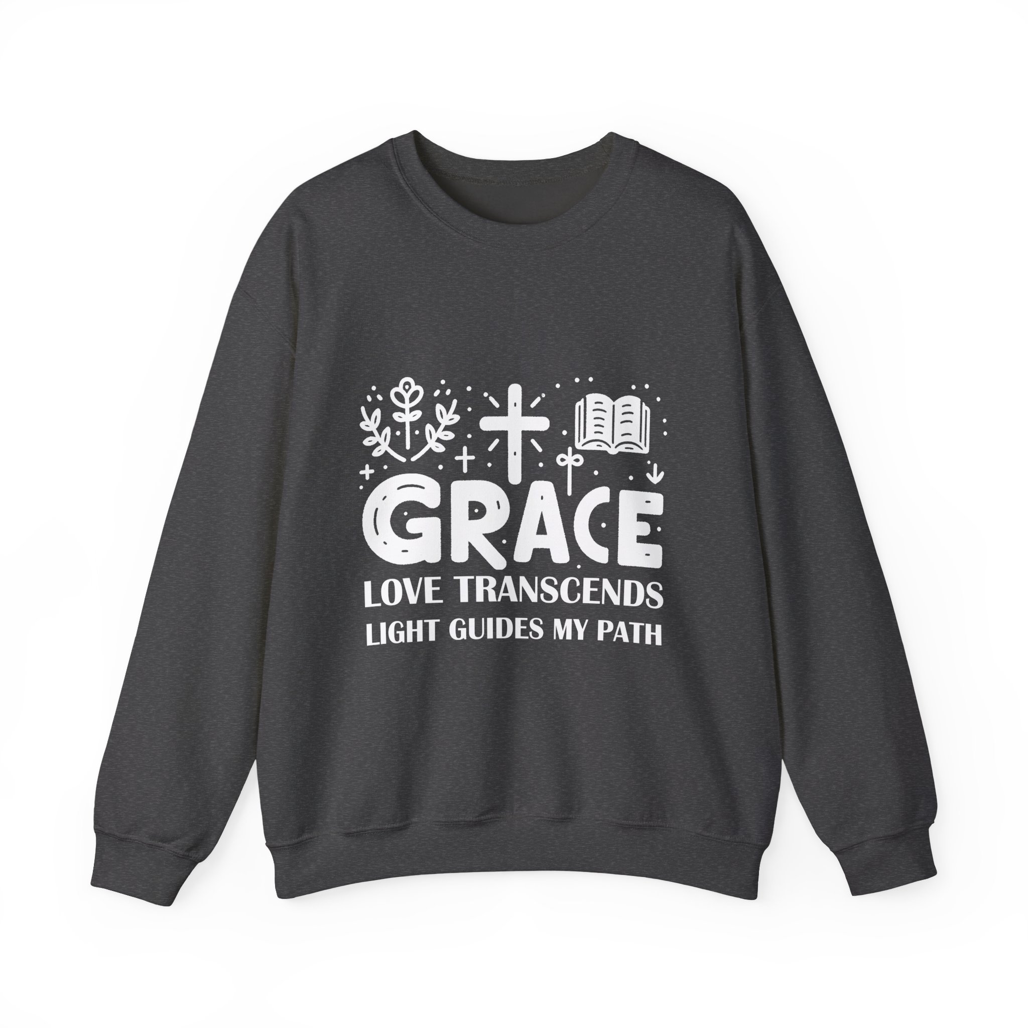 Soft, simple, and quietly devotional — this crewneck carries a gentle message of faith you can wear every day. The clean white fleece becomes a calm backdrop for bold black lettering and small illustrative icons: a cross, an open Bible, and tiny floral accents that feel hand-drawn. The words “GRACE / LOVE TRANSCENDS / LIGHT GUIDES MY PATH” sit like a personal reminder to move through the day with hope and humility. It’s roomy without feeling bulky, with a classic crew neckline and durable double-needle stitching that stands up to regular wear. Slip it on for slow mornings, church gatherings, volunteer days, or evenings curled up reading — it settles into the quieter moments and speaks softly about what matters most.