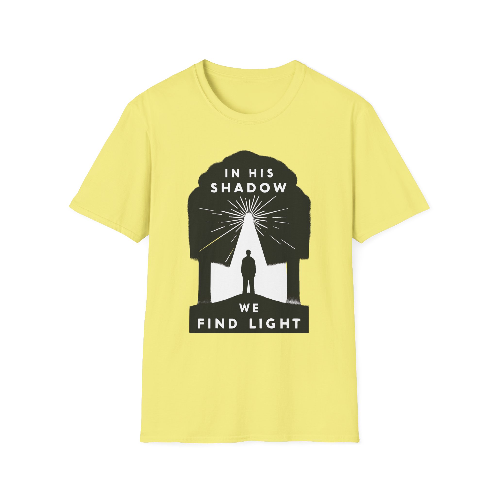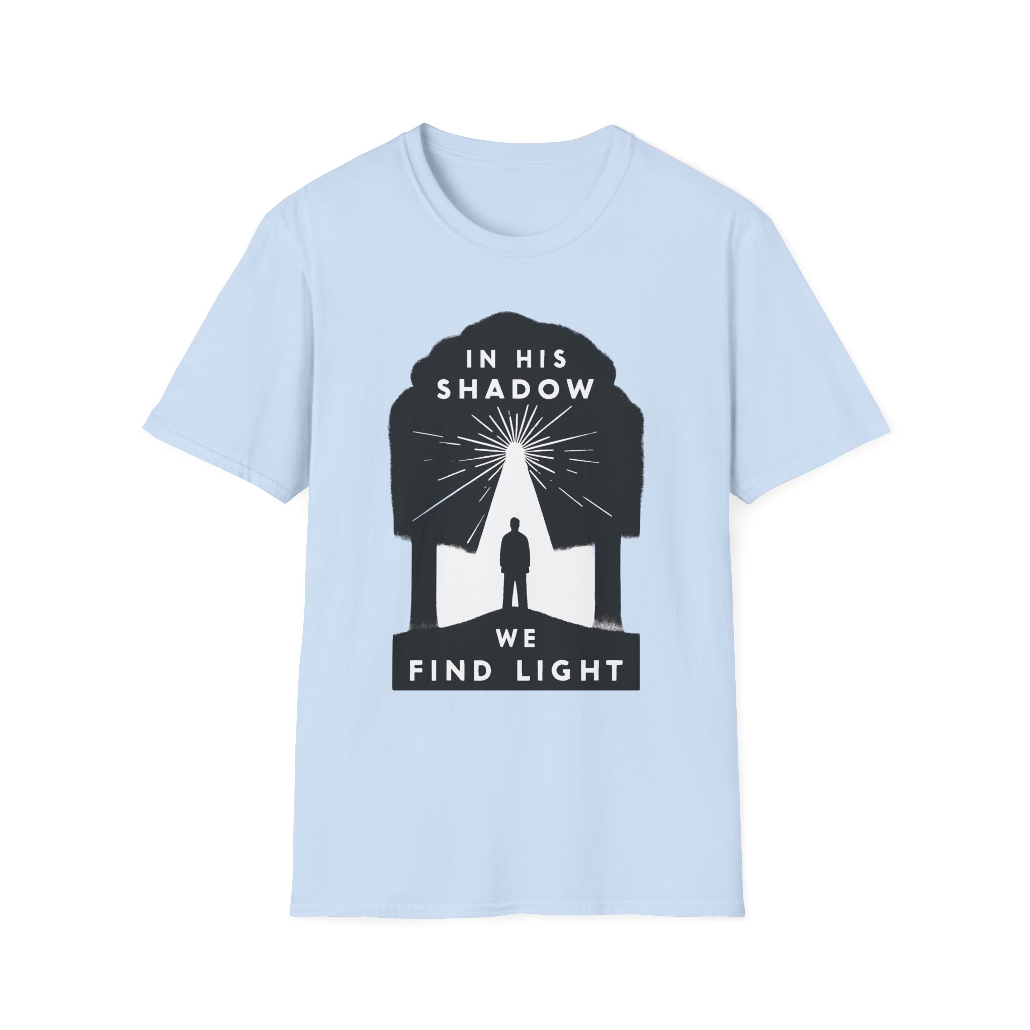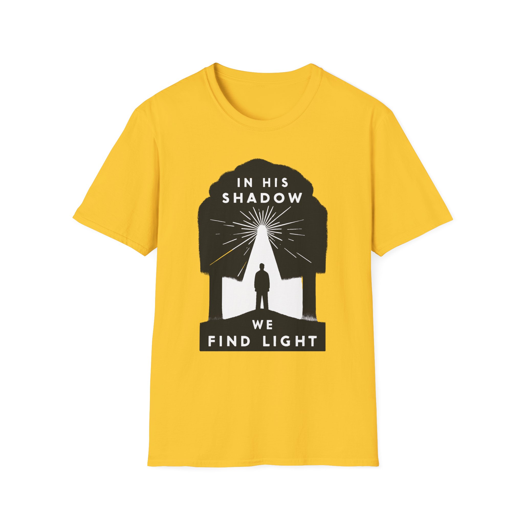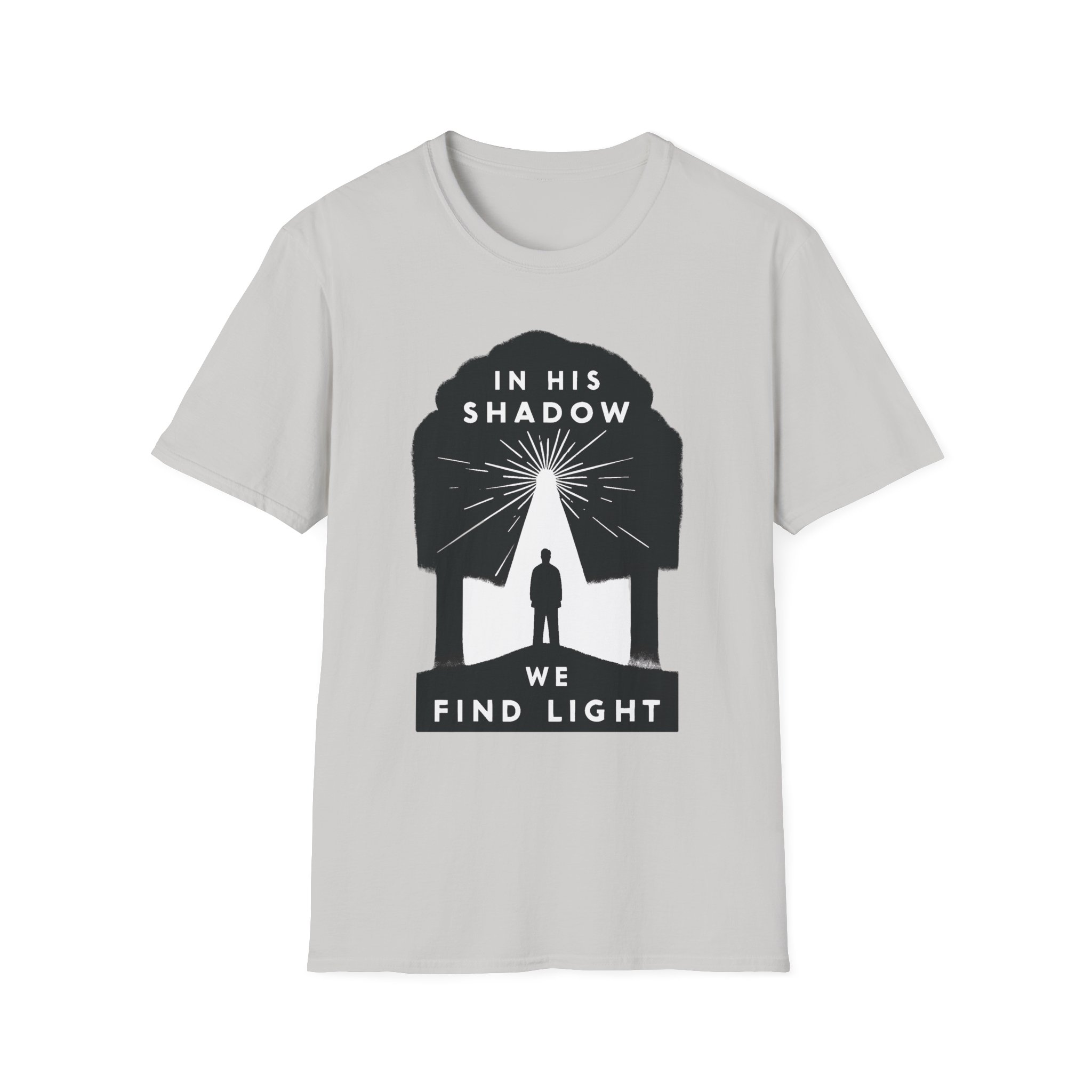 A soft, breathable tee that carries a quiet message: “In His shadow we find light.” The minimalist black graphic frames a lone figure beneath a tree-shaped silhouette, rays of light breaking through — a subtle statement of faith and hope that reads gentle, not loud. The lightweight ring-spun cotton feels smooth against skin and holds print detail crisply, so the design sits cleanly whether you wear it to church, a small group, or a reflective walk. The crew neck and classic fit keep the silhouette timeless and easy to layer under jackets or over casual trousers. Comfortable enough for everyday wear, this shirt moves with you while sharing a thoughtful, contemplative sentiment.
