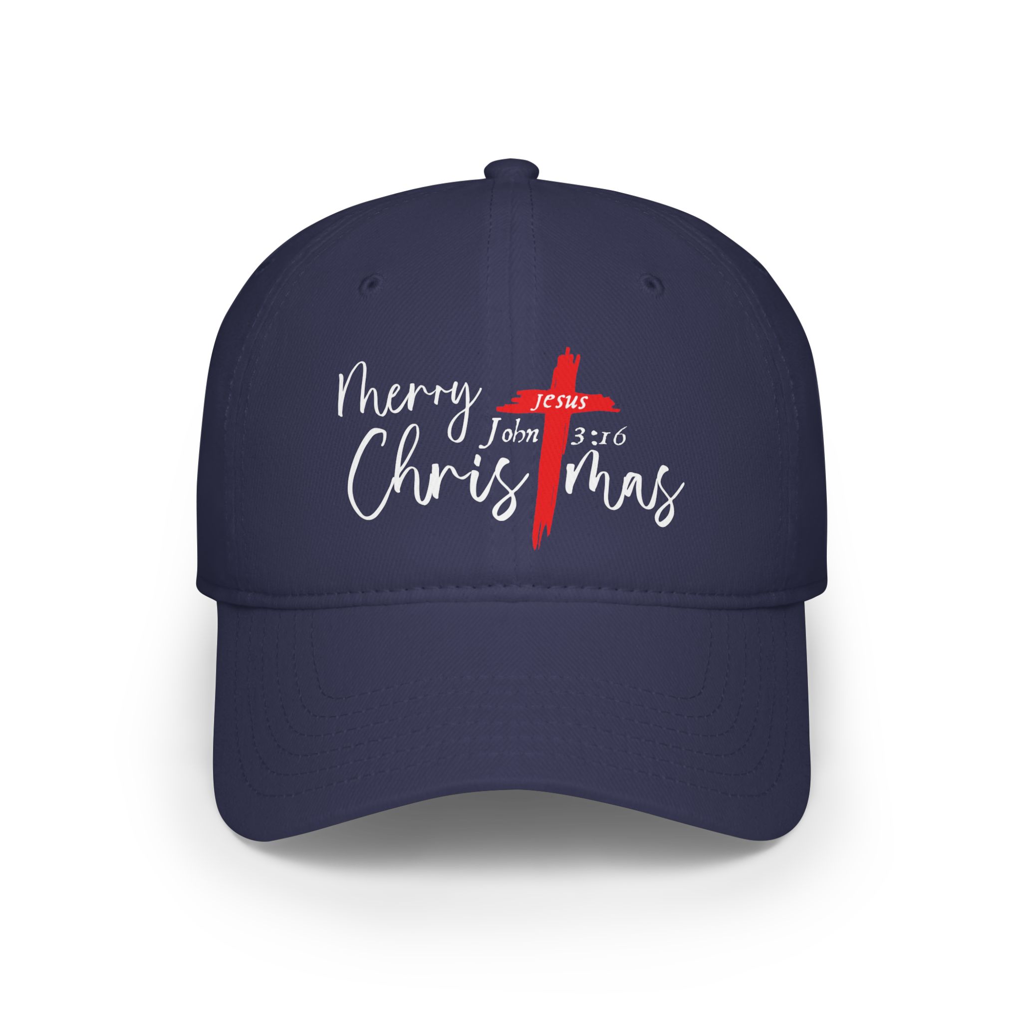 A low-profile cotton baseball cap embroidered with a simple, faith-forward Christmas design. The red twill hat features a handwritten-style “Merry Christmas” script crossed by a subtle brushstroke cross with “John 3:16” integrated into the artwork. Lightweight and unstructured, it sits close to the head for a relaxed, lived-in look — the kind of cap you slip on for carols, church gatherings, or a winter walk through twinkling neighborhood lights. The adjustable Velcro strap keeps the fit personal, while reinforced interior stitching holds up to repeated wear and seasonal outings. It reads as warm and humble: a small, wearable reminder of the season that complements casual winter outfits and community celebrations.