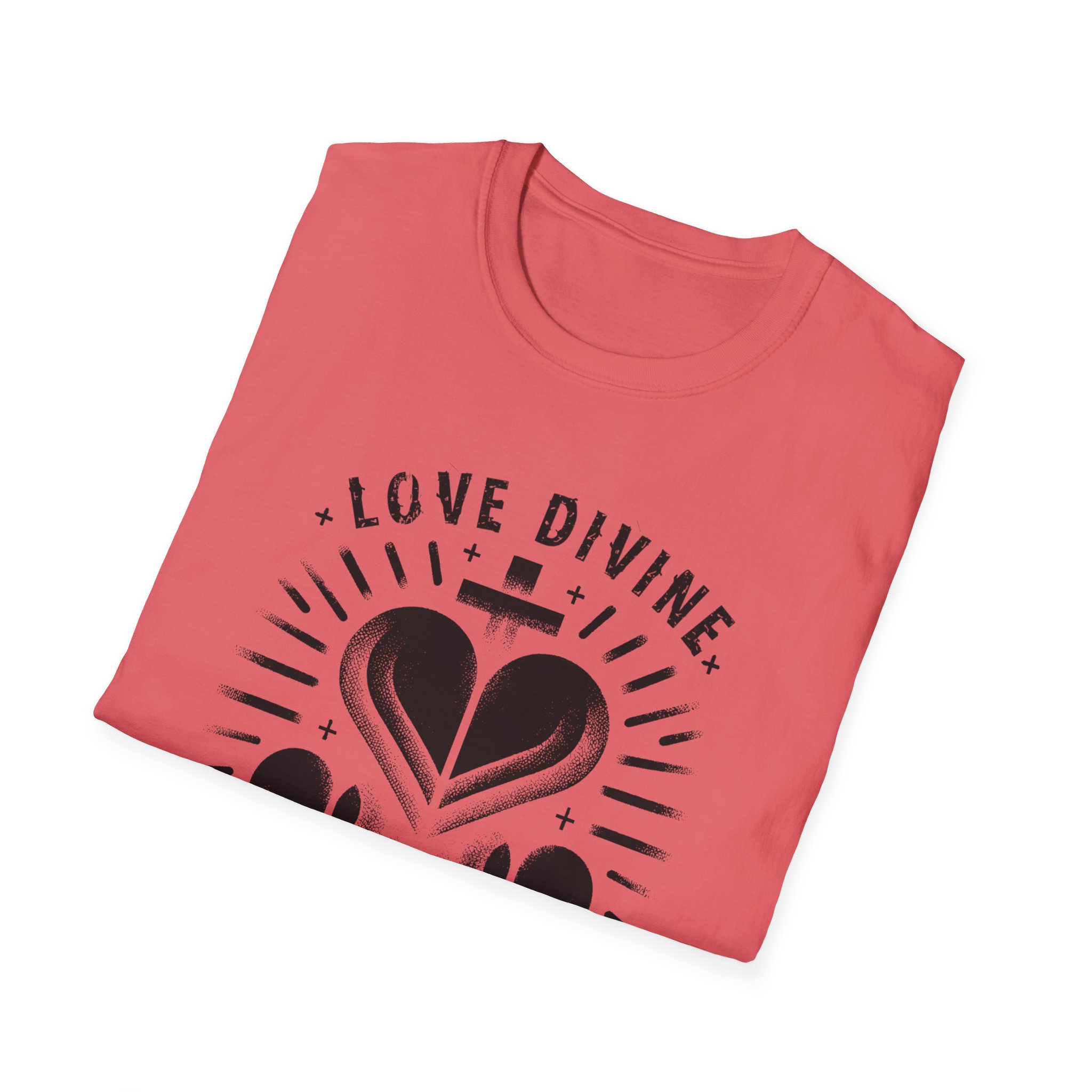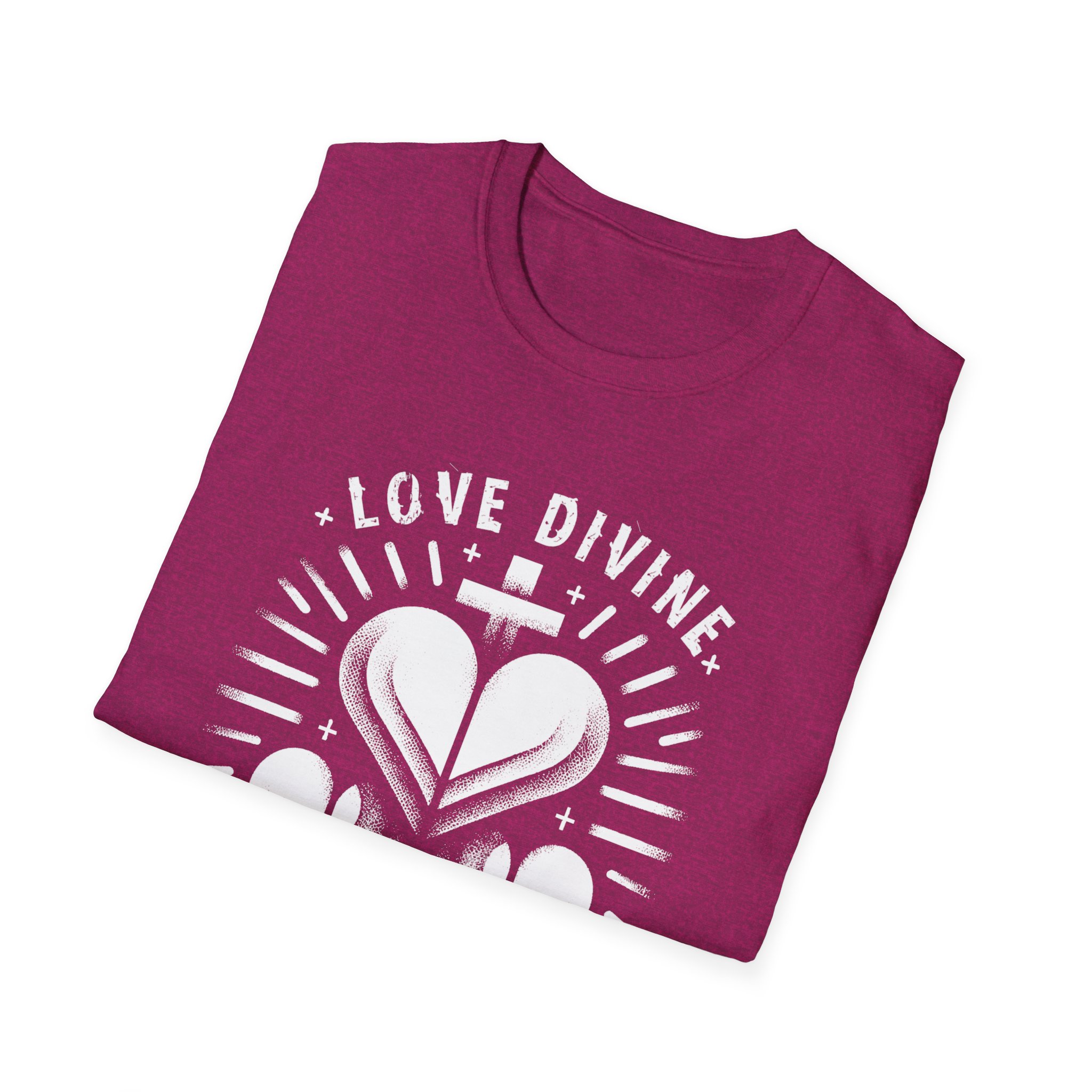 Soft, breathable cotton against your skin, carrying a quiet, spiritual message: three stylized hearts radiate from the chest with the words “LOVE DIVINE” above and “HEARTS ALIGNED” below. This lightweight tee slips into everyday life — worn alone on a bright morning or layered under a jacket at a gathering — and reads as both personal reminder and gentle statement. The print’s slightly distressed, stencil-like look gives it a handcrafted, altar-poster feel that sits well with meditative mornings, cottage hangs, or evening bonfires where conversation drifts to what matters. It’s simple, sincere, and made to be lived in until the fabric softens and the lines carry stories of their own.