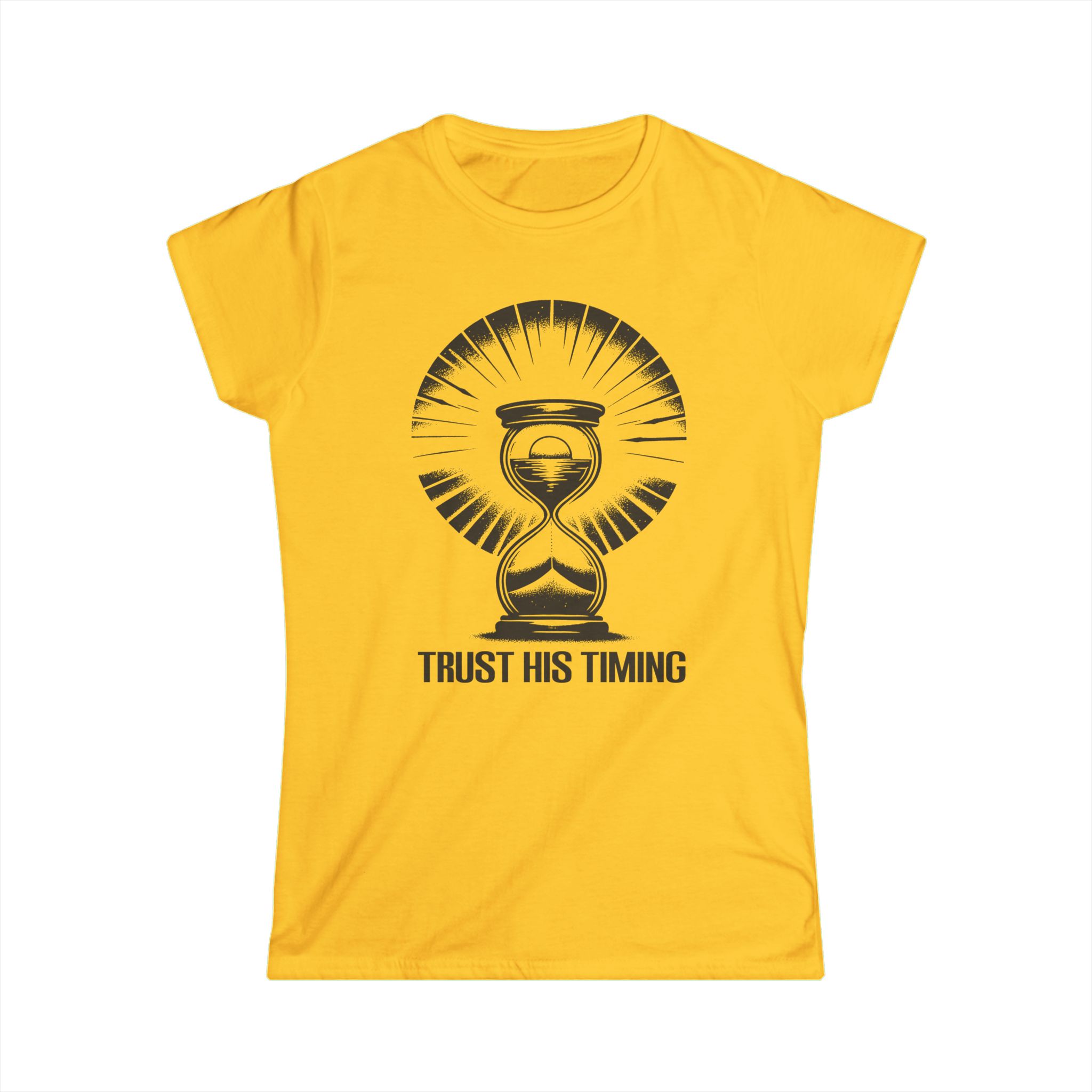 Lightweight and softly contoured, this tee carries a quiet message: Trust His Timing. A graceful hourglass graphic with radiating lines sits over the chest, rendered in muted monochrome for a calm, contemplative look. The semi-fitted silhouette and tear-away label keep the shirt comfortable for all-day wear. Wear it layered under a cardigan, with jeans and sneakers, or to church gatherings where the message sparks gentle conversation. It’s for those who find strength in patient faith and want an everyday reminder to lean into timing rather than rush it.