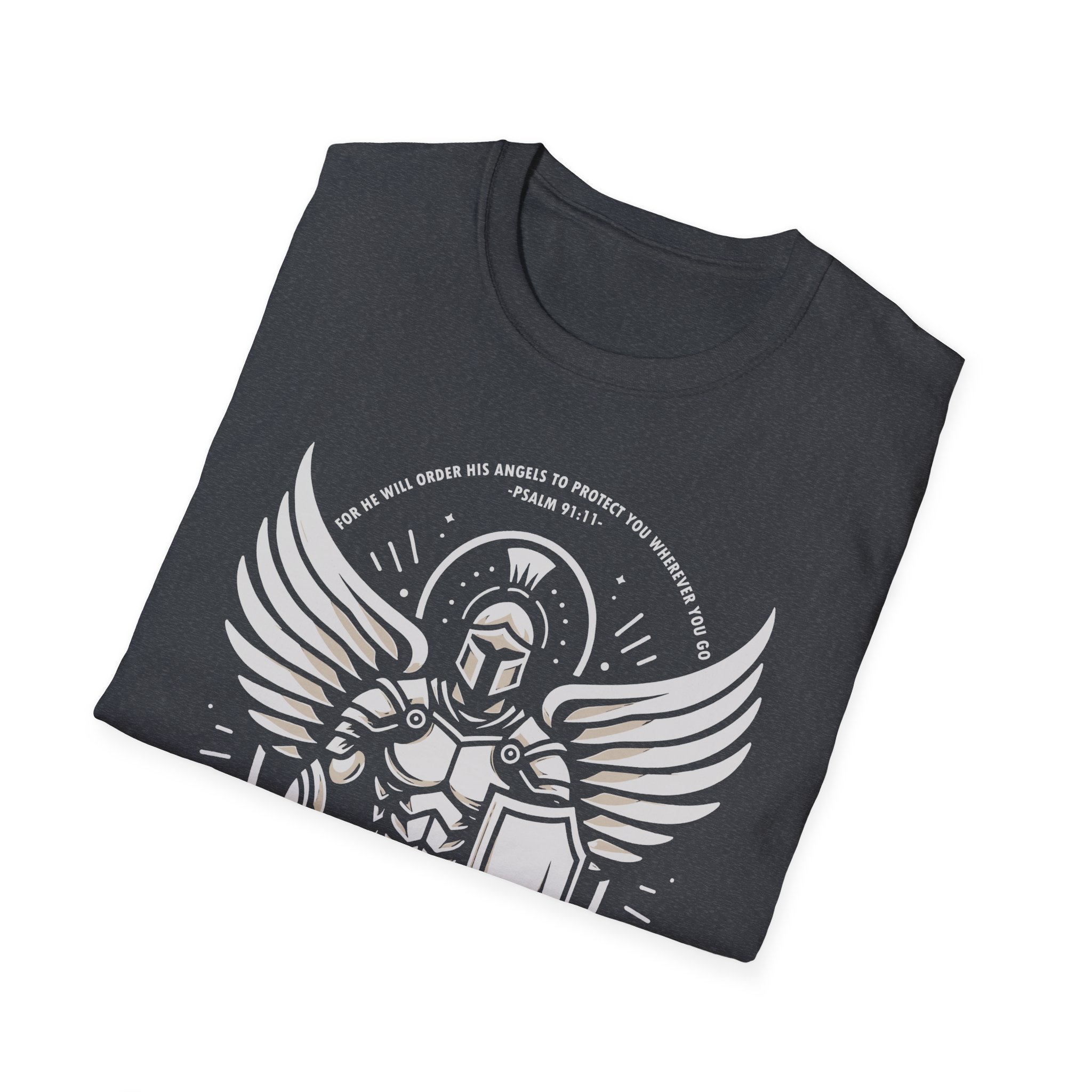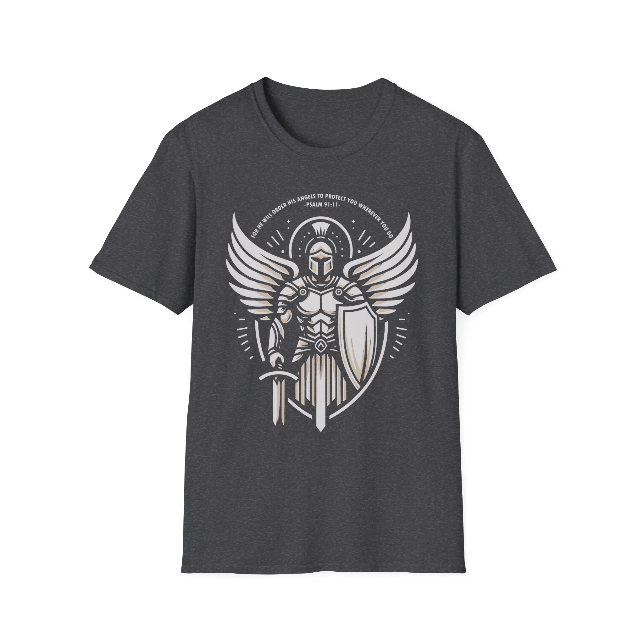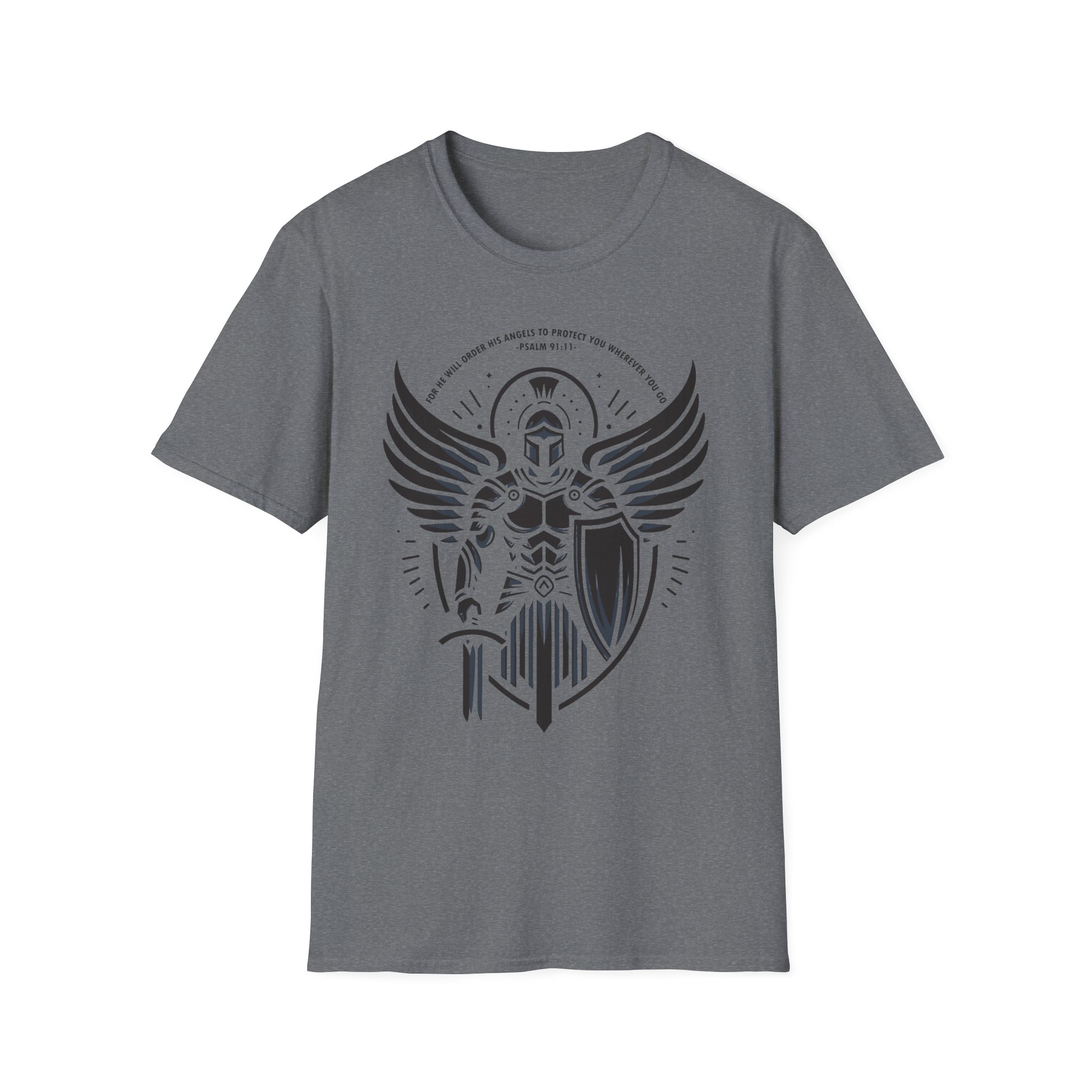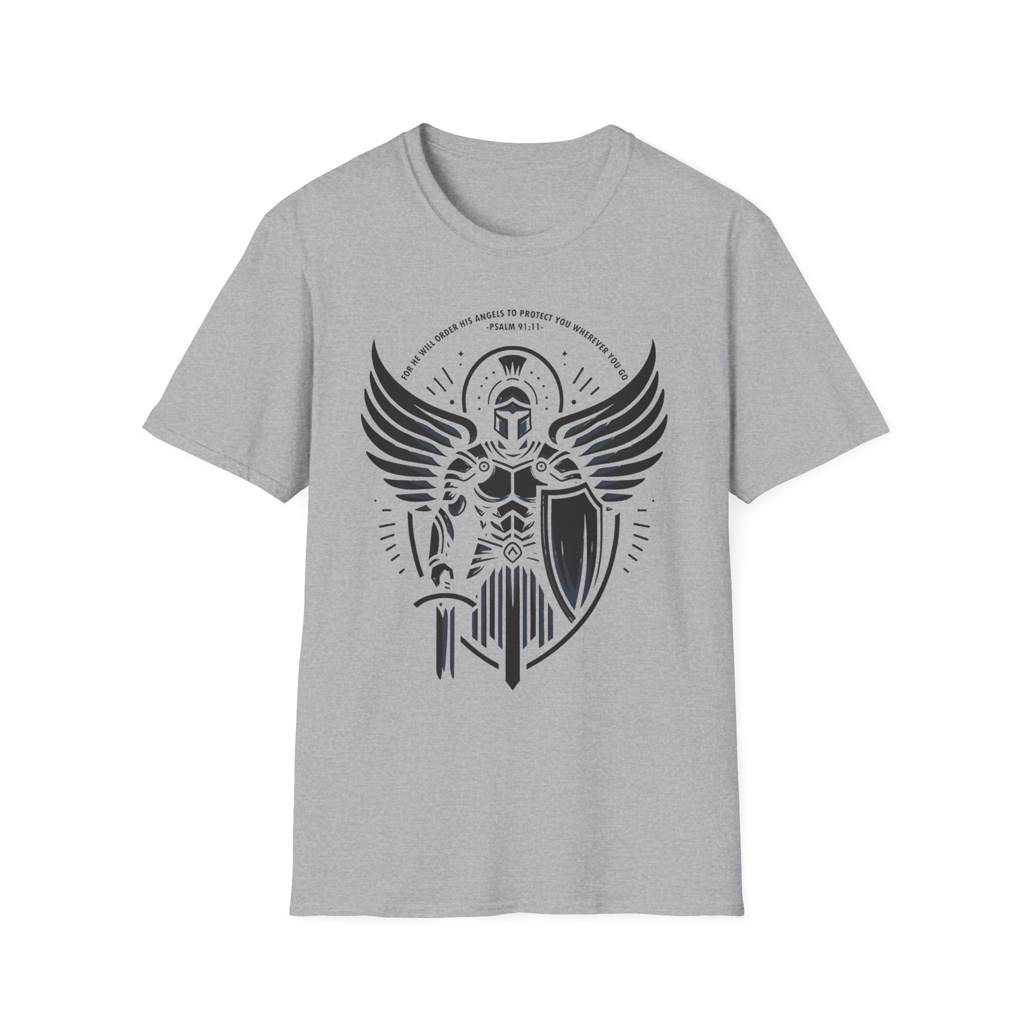 This lightweight tee carries a bold, emblematic design that reads like a personal standard. The graphic — a stylized armored guardian with outstretched wings, shield, and sword — feels both mythic and modern: part heraldic sigil, part street-ready insignia. On soft, ring-spun cotton the print sits crisp and slightly distressed, so the shirt looks lived-in from the first wear. Wear it to anchor a layered outfit, to bring a sense of quiet strength to everyday errands, or as a standout piece at meetups and casual gatherings. The crew neckline and classic fit keep the silhouette clean while the tear-away label ensures no itch or distraction. This is a shirt for people who like their style to tell a story — of resilience, honor, and a readiness to stand your ground.