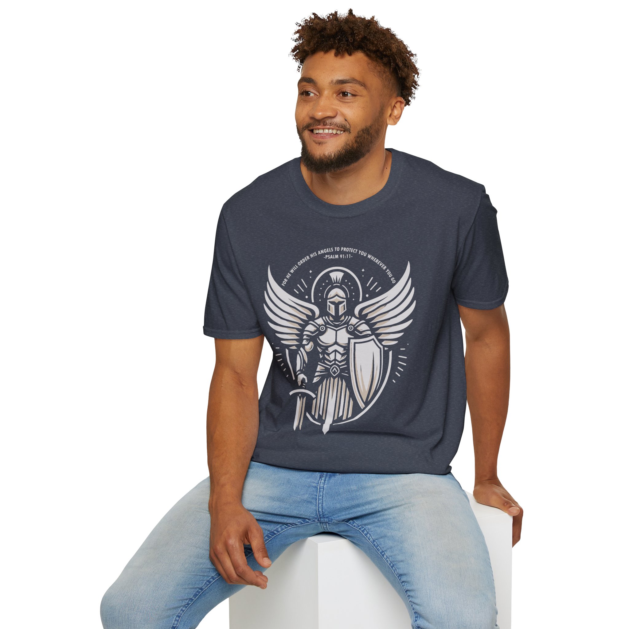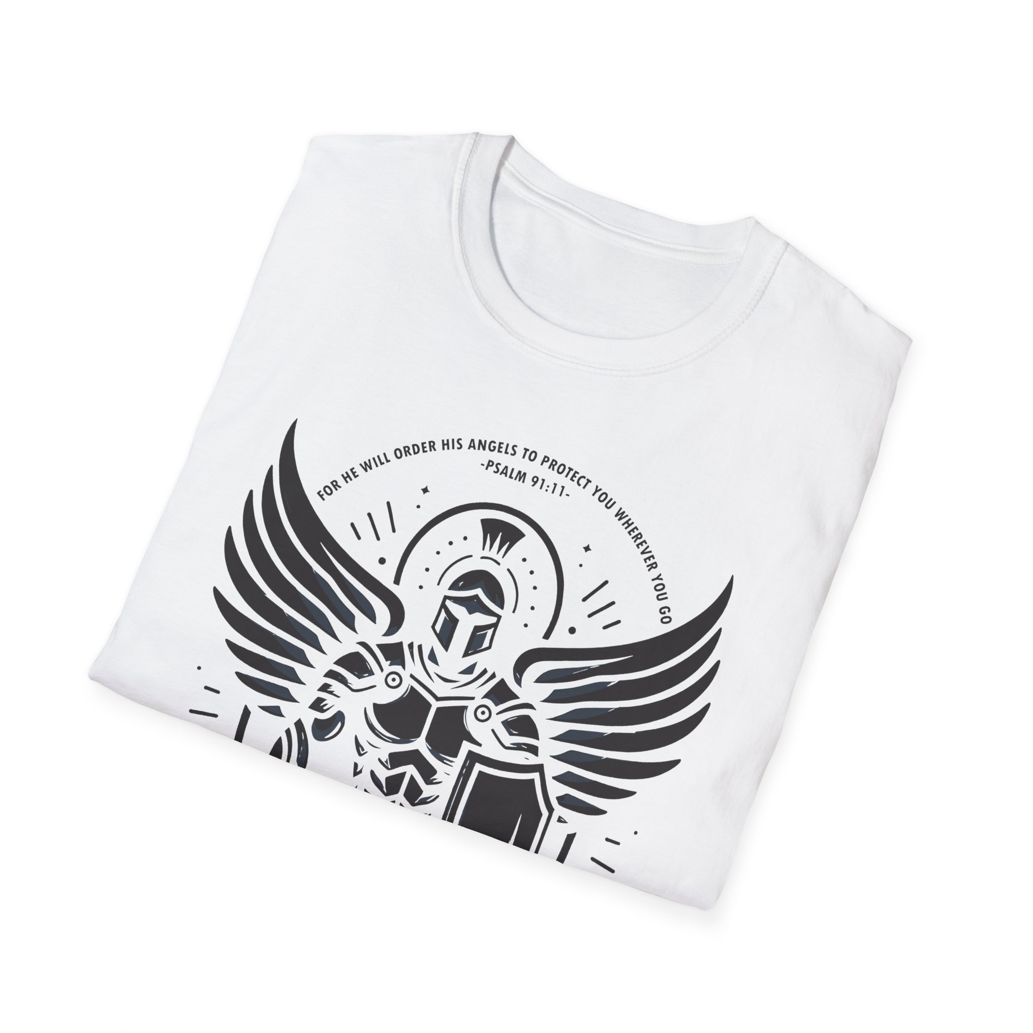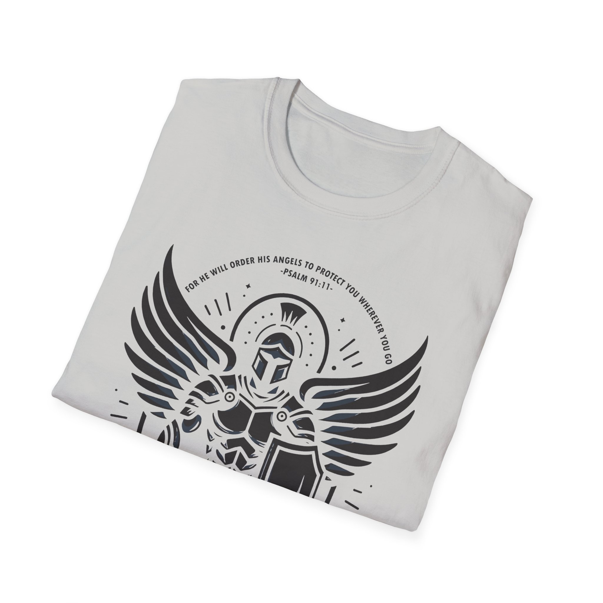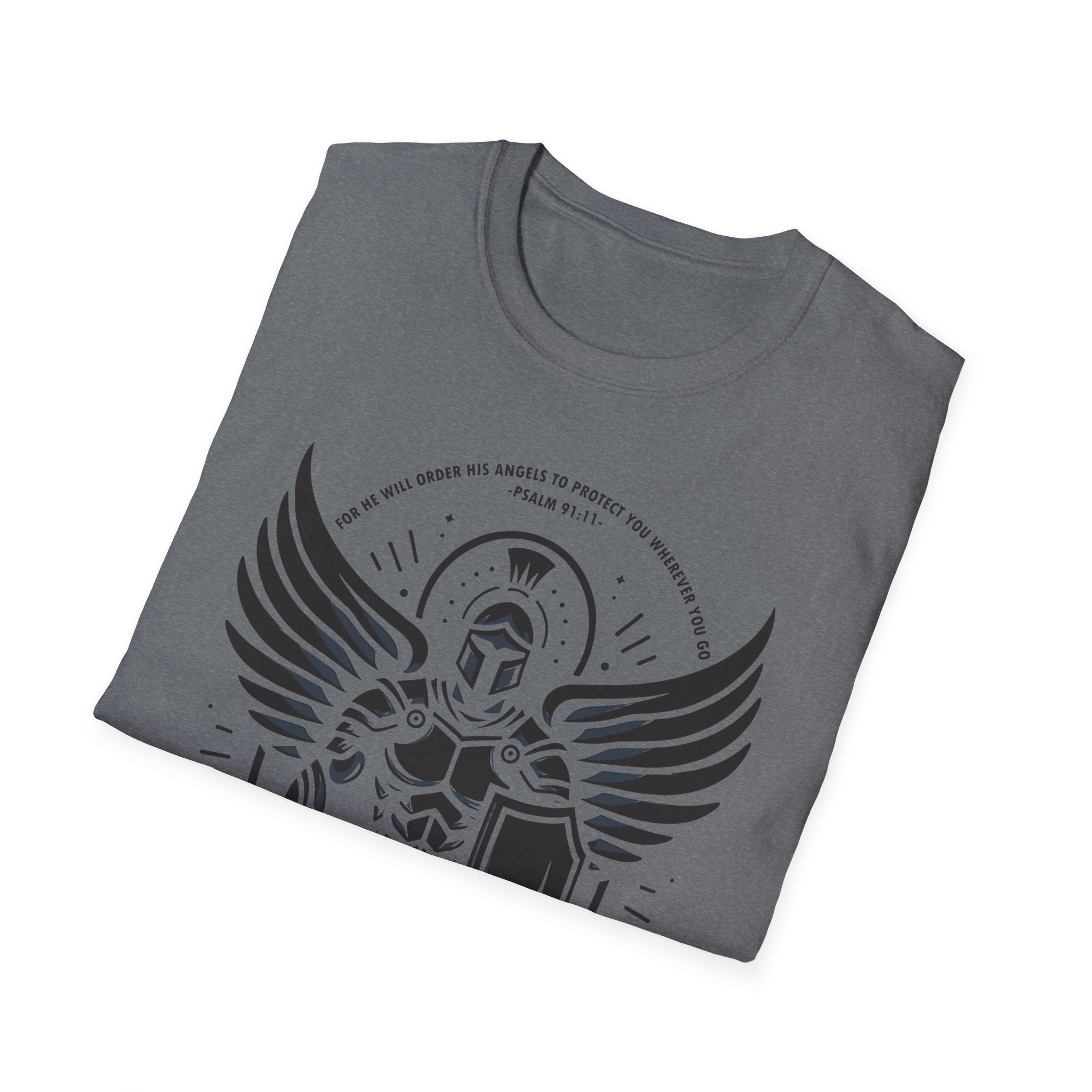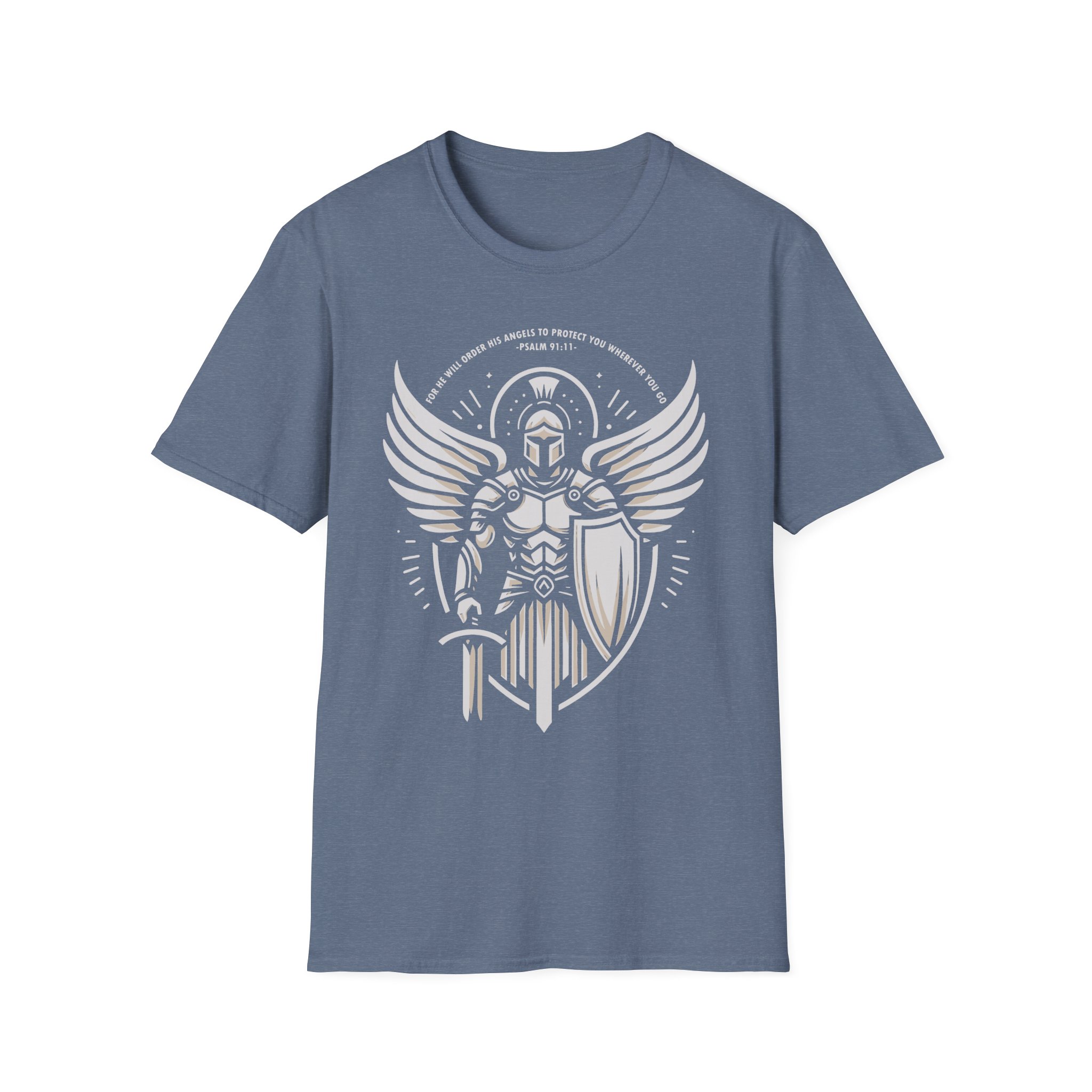 This lightweight tee carries a bold, emblematic design that reads like a personal standard. The graphic — a stylized armored guardian with outstretched wings, shield, and sword — feels both mythic and modern: part heraldic sigil, part street-ready insignia. On soft, ring-spun cotton the print sits crisp and slightly distressed, so the shirt looks lived-in from the first wear. Wear it to anchor a layered outfit, to bring a sense of quiet strength to everyday errands, or as a standout piece at meetups and casual gatherings. The crew neckline and classic fit keep the silhouette clean while the tear-away label ensures no itch or distraction. This is a shirt for people who like their style to tell a story — of resilience, honor, and a readiness to stand your ground.